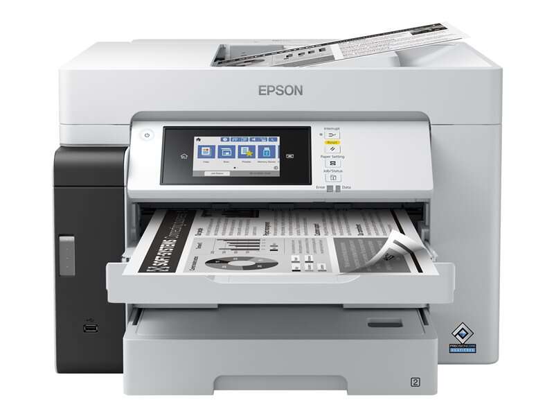 Stampa, scansione e fotocopia con questo dispositivo Epson EcoTank Pro ET-M16680 Wi-Fi di facile utilizzo, con un costo per pagina eccezionalmente basso e un consumo energetico ridotto grazie alla tecnologia No Heat.