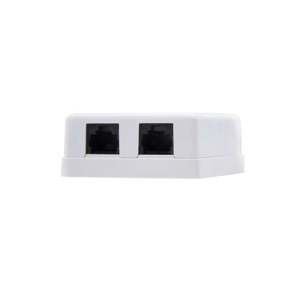 Rosone per montaggio a superficie con due prese per connessione RJ45 Cat.6 UTP.nSpecifiche:n-Colore: Biancon-Standard: RoHSn-Test di prestazione: testato al 100%.