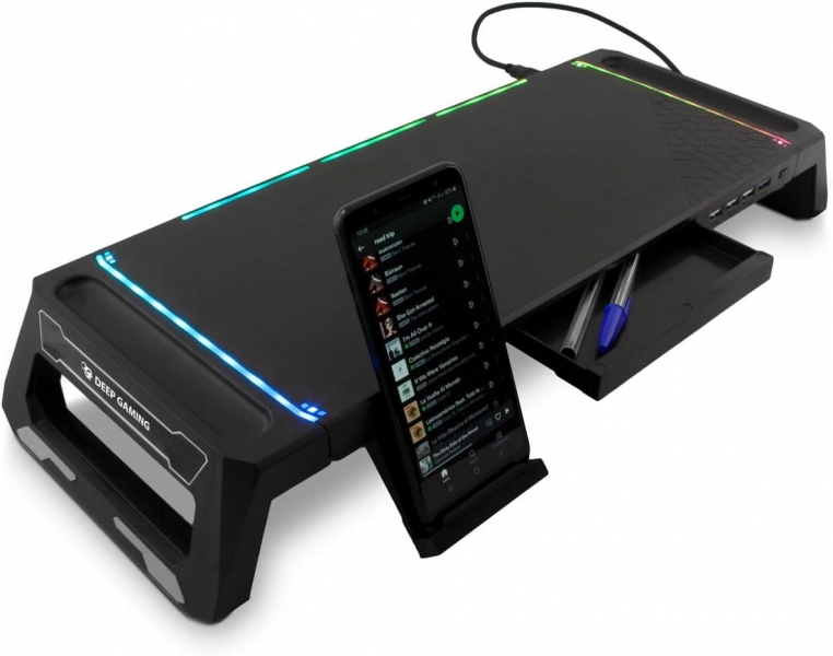 Con hub USB a 4 porte e 10 modalità RGBnCompletate la vostra configurazione di gioco e ottimizzate lo spazio sulla scrivania.nMigliorate l’ergonomia della vostra postazione di lavoro o dell’area di gioco regolando l’altezza del monitor Per una posizione più comoda. Ottimizzate lo spazio libero sulla scrivania grazie al supporto per smartphone e al cassetto portaoggetti integrati.nCaratteristiche:n-Scegliere tra 10 effetti di illuminazione RGB o spegnere l’illuminazione con il pulsante sulla parte anteriore.nHub USB a 4 porte per una maggiore connettività al computer: 1 x USB3.0 + 3 x USB2.0.n-Gambe pieghevoli che permettono di regolare il monitor a due altezze per la posizione d’uso più comoda.n-Cassetto per riporre penne o appunti e supporto per smartphone incluso.nSpecifiche:n-Illuminazione: RGB 10 modalità.n-Porte: 1 x USB3.0 + 3 x USB2.0n-Alimentazione: USB DC 5Vn-Dimensioni del supporto: 55 x 8 x 8 x 20 cmn-Dimensioni cassetto: 15 x 7 cmn-Superficie di appoggio del monitor: 40 x 20 cmn-Peso: 1,5 kgn-Materiale: ABSn-Colore: Nero